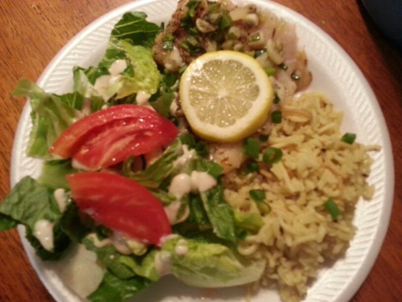 I told my sister I would bake fish for dinner and some make some rice. Zach asked for chicken flavored rice I said ok specially since I had some rice a roni in the cabinet. She said she would make a salad.